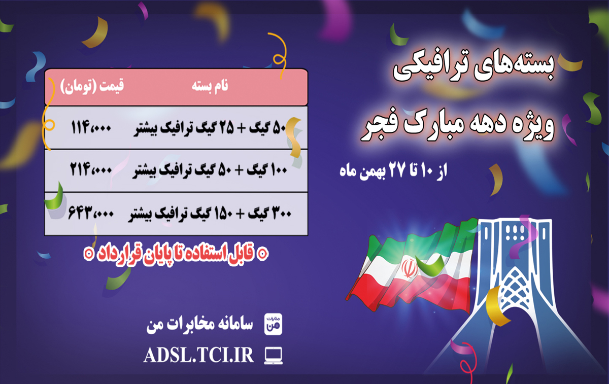 مشتریان برای خرید و استفاده از بستههای ترافیکی ویژه دهه فجر، میتوانند به پنل کاربری خود در adsl.tci.ir مراجعه و یا از طریق سامانه و اپلیکیشن «مخابرات من» به نشانی my.tci.ir اقدام کنند.