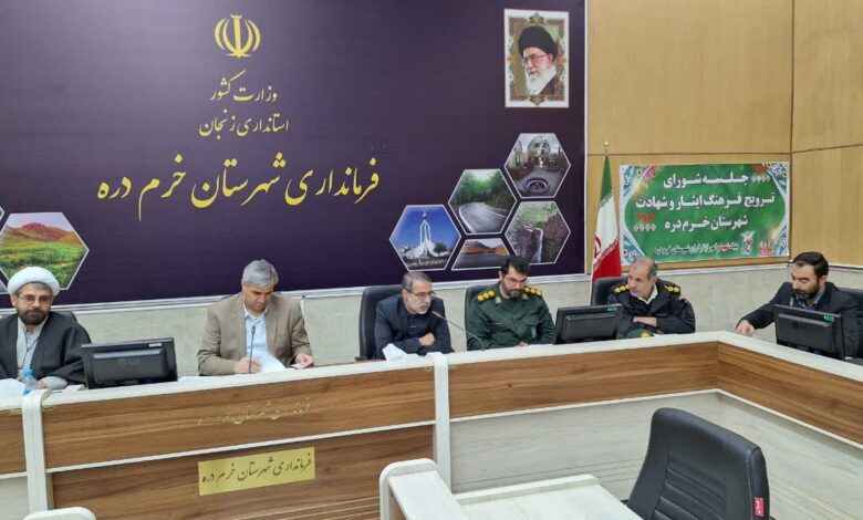 به گزارش پایگاه خبری زنجان ورزشی 24،جلسه شورای ترویج و توسعه فرهنگ ایثار و شهادت شهرستان خرمدره به ریاست نوری فرماندار شهرستان و با حضور حجت الاسلام والمسلمین زاهدیپور امامجمعه، برزگر مدیرکل بنیاد شهید و امور ایثارگران استان، جمعی از مسئولان عضو این شورا، خانواده های معظم شهدا و ایثارگران در سالن جلسات فرمانداری این شهرستان برگزار شد.