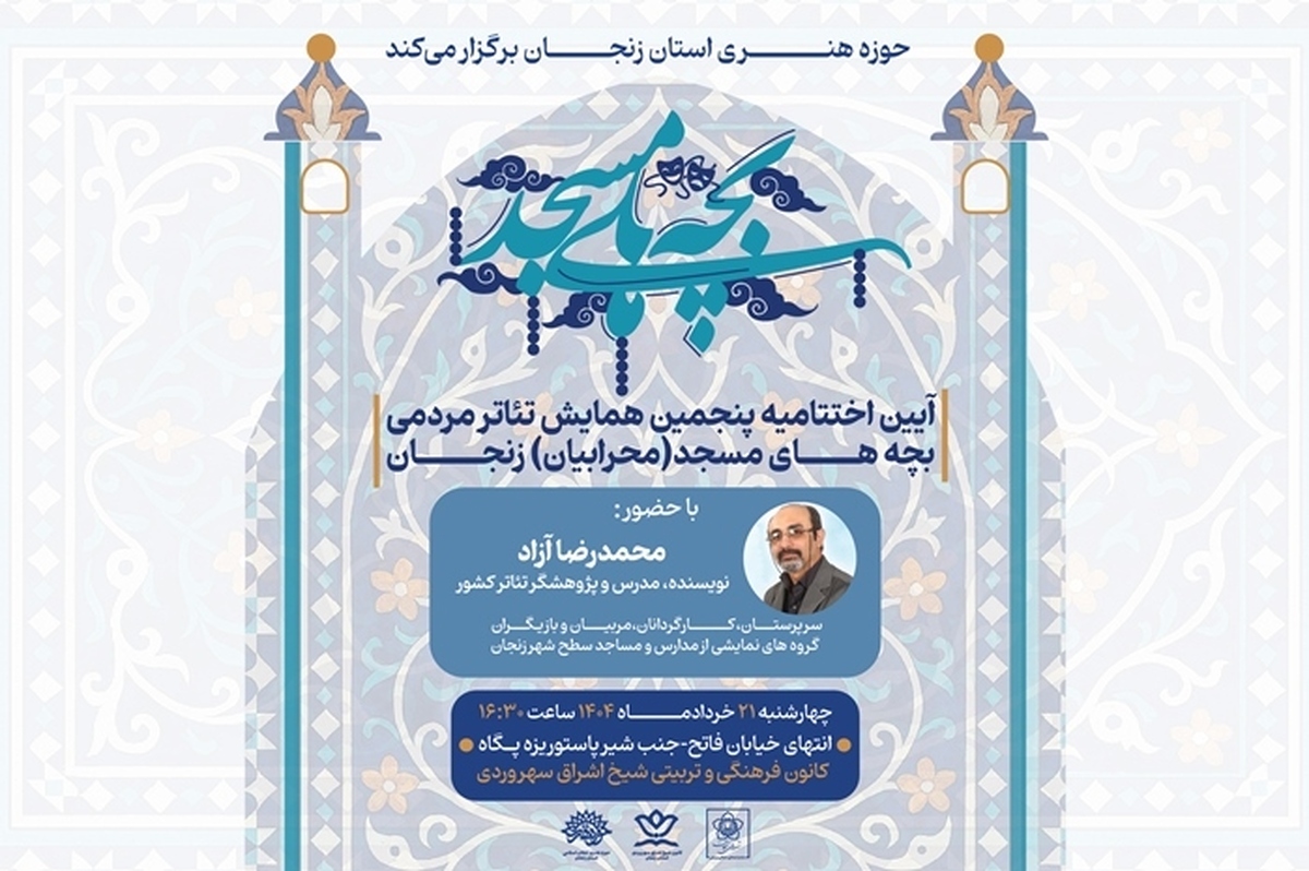 به گزارش پایگاه خبری زنجان ورزشی 24،آیین اختتامیه پنجمین همایش تئاتر مردمی بچههای مسجد، ساعت ۱۶:۳۰ روز چهارشنبه ۲۱ خردادماه ۱۴۰۴ در کانون فرهنگی تربیتی شیخ اشراق سهروردی برگزار خواهد شد.